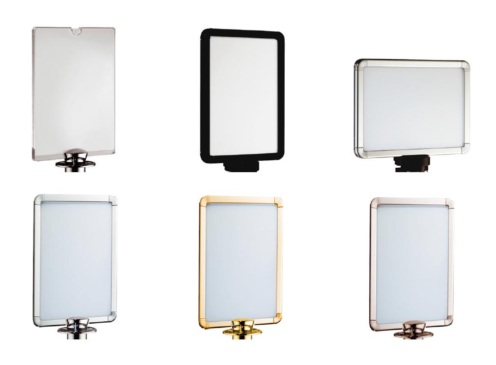 Pancarta informativa con marco de aluminio o 3 acabados: cromado, níquel mate y latón o Disponible en formato A4 y A3, en posición vertical u horizontal o Únicamente compatibles con los modelos de Luxor y Abydos