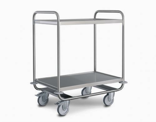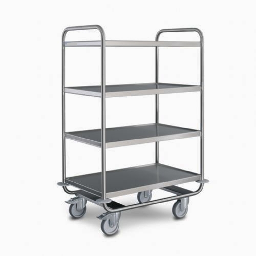 Carro fabricado enteramente en acero inoxidable Equipamiento de serie o Carro de servicio fabricado con estructura monobloque o 2, 3 o 4 estantes de acero inoxidable o Ruedas Ø 125 mm (2 con freno) o Paragolpes anulares de protección