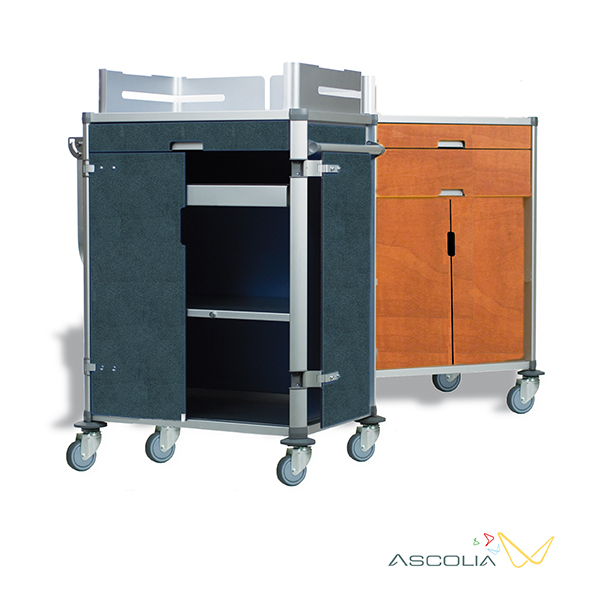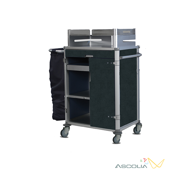 Carro de housekeeping compacto, adaptado a los espacios reducidos Equipamiento de serie: o 4 acabados para escoger o 3 niveles de colocación para la ropa limpia o 4 ruedas pivotantes de Ø 125 mm, termoplásticas o 4 paragolpes anulares de protección